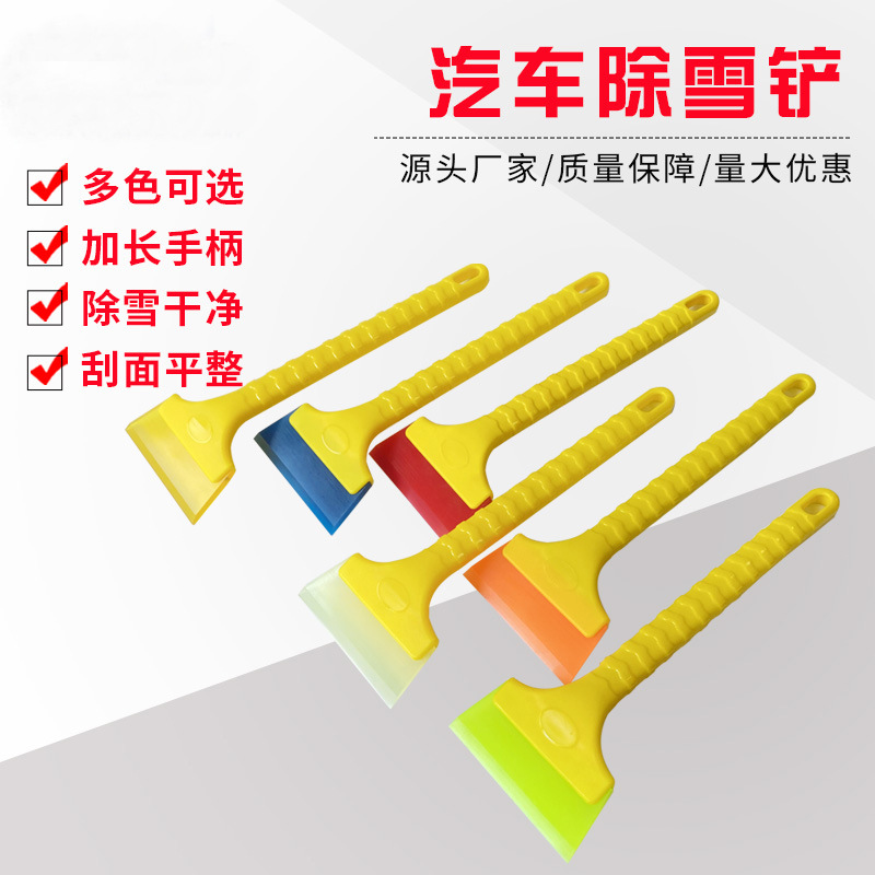 牛の筋の長い柄のガラスの水は自動車の前でガラスの雪を遮って雪かきをします。