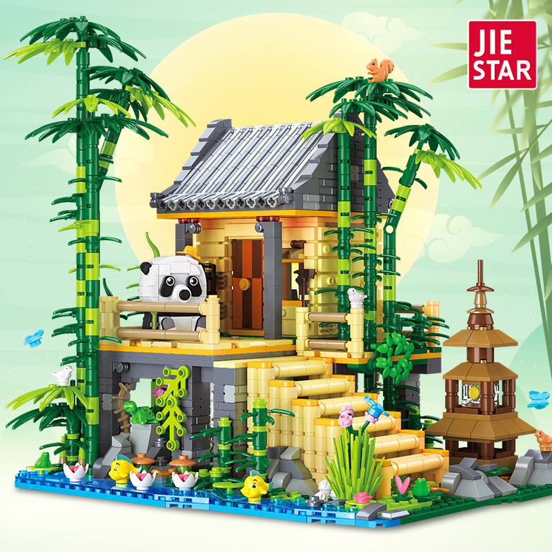 傑星59093竹林パンダの小屋は明かりをつけて積み木のおもちゃを組み立てて子供の男の子の越境の贈り物を並べます。