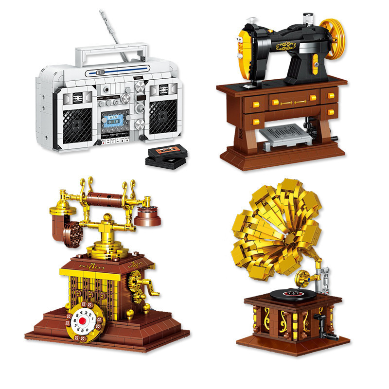 哲高00936-00940レトロ積み木ミシンタイプライター蓄音機電話機子供合わせおもちゃ