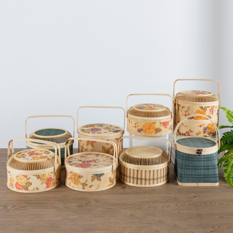 丸い竹かご、竹かご、竹編み中秋月餅包装、青い竹箱、ギフトバスケット、大小の絶妙な竹