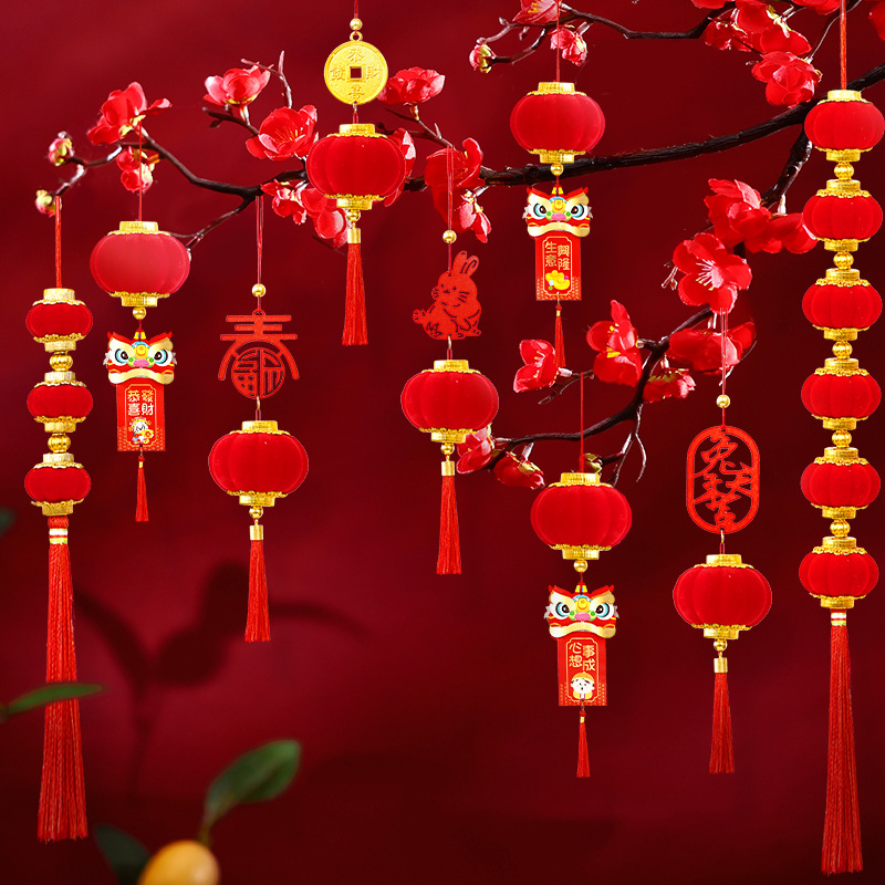 植毛大紅小提灯連列装飾ストラップ室内客間デパート店舗屋外シーン配置品