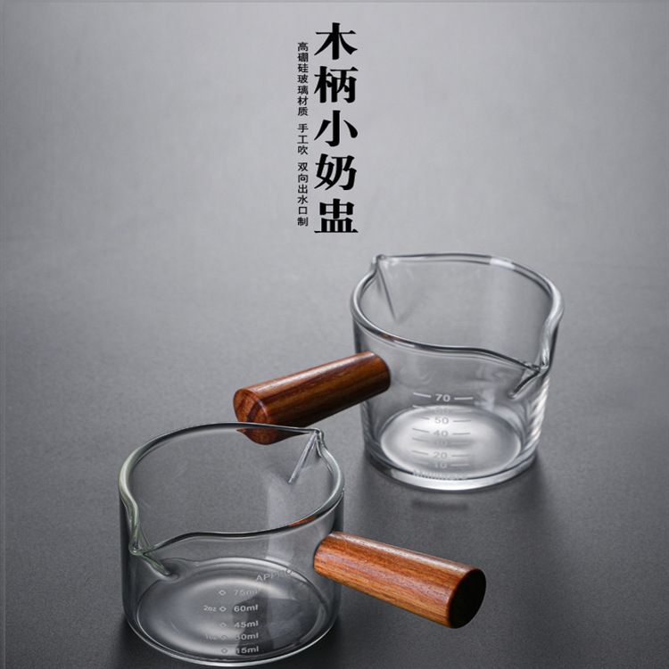 木の取っ手のガラスの計量カップのガラスの小さいミルクの杯の日本式のエスプレッソとミルクのカップは尖った口の小さいミルクの缶を持って目盛りがあります。