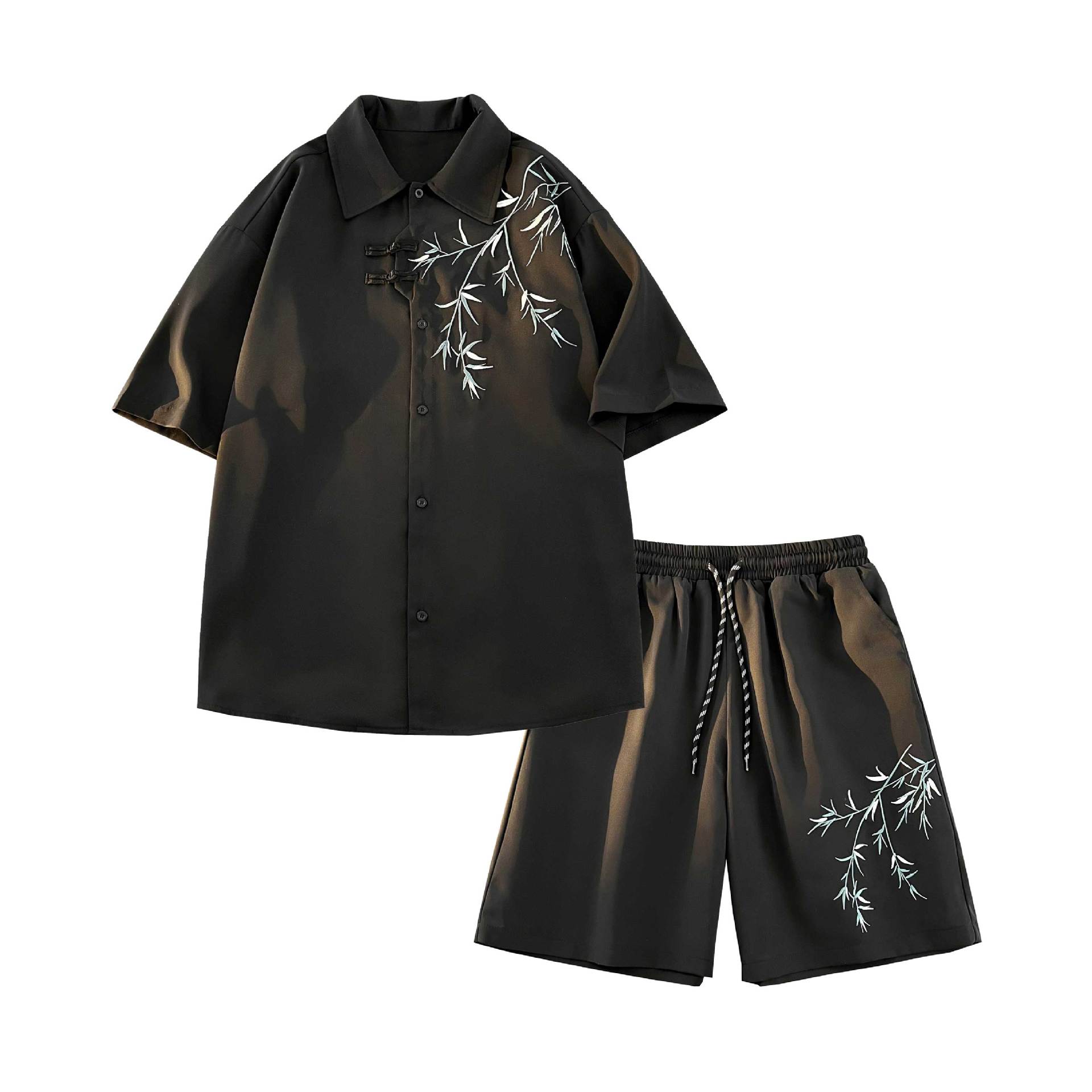 中国風刺繍シャツセット五分ズボンゆったり版型百合半袖シャツセットcs931 + dk933