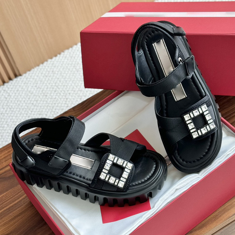 ラインストーン厚底カジュアルスポーツ黒靴身長増加サンダル女性の多用途ファッションスクエアバックル rv2025 夏の新スタイル