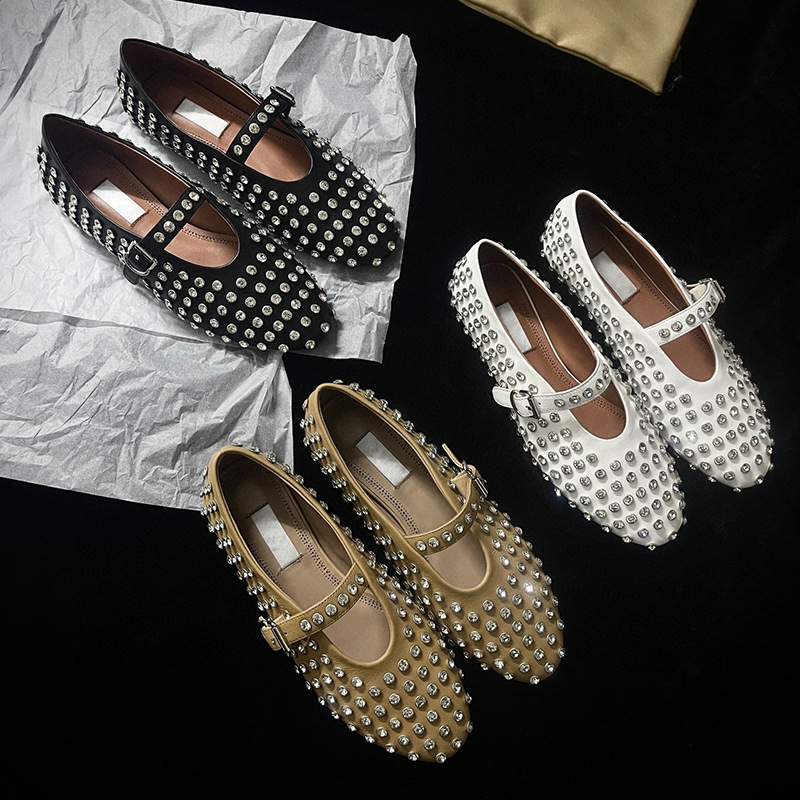 2024年新作 フルダイヤモンドリベットフラットシューズ フレンチバレエシューズ 甘くてクールなレディース春ワンラインバックルストラップシューズ