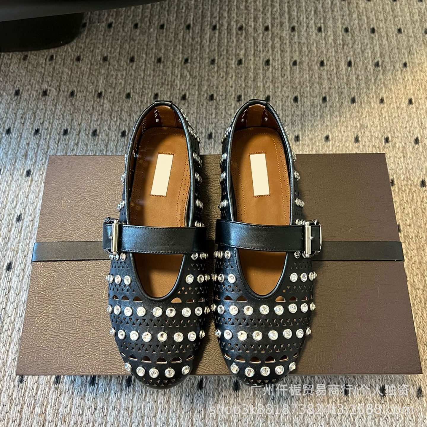 ハイバージョンニッチな新しい本革リベット中空ラインストーンバレエシューズ女性用通気性フルダイヤモンドフラットメリージェーンシューズ
