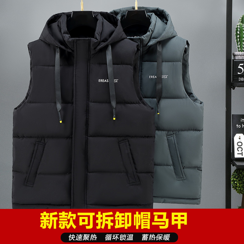 馬甲男は秋冬の流行の羽毛の綿のベストの肩の大きいサイズの保温のカップルを厚くして馬を挟んで帽子のコートを分解することができます。