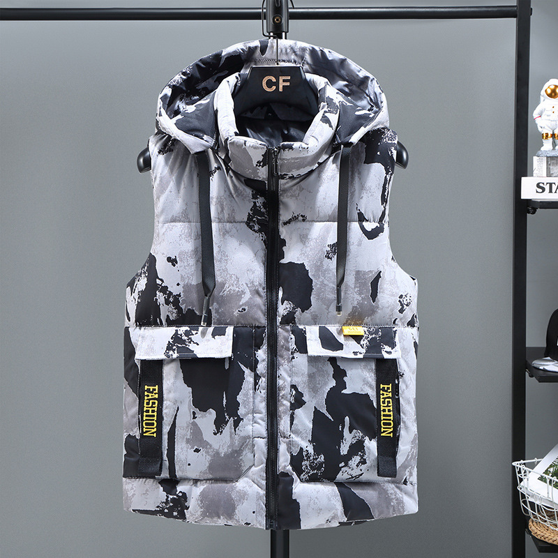 冬用フード付きベスト、厚手ダウンコットンベスト、メンズ冬服ノースリーブベスト、カスタムロゴ入り