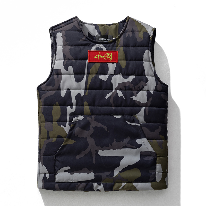 2023秋の新型男性の肩の保温の小さいベストの綿の馬甲は冬にニワトリの丸首のカバーの頭を食べて迷彩の馬の挟みを保証します。