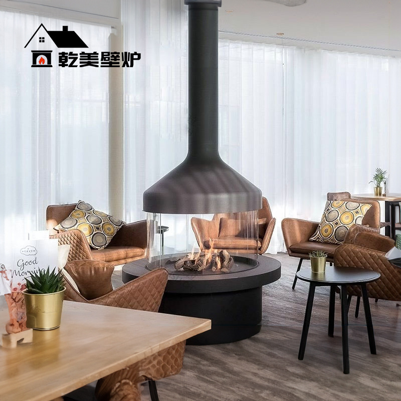 乾美吊下げ式暖炉、薪燃焼、天井吊り下げ、円形、特殊形状、暖房、別荘、民宿、リビングルーム、電子式、北欧風