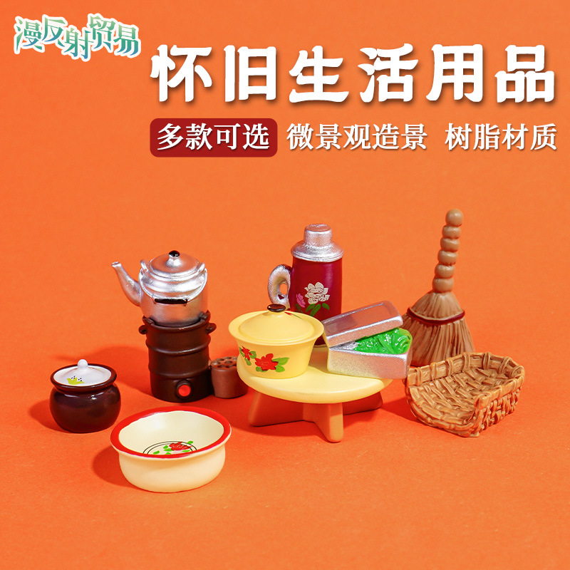 レトロなレトロな装飾品の部品の小さい景観の生活用品は水タンクのガスボンベの石炭ストーブの湯たんぽの家を並べます。
