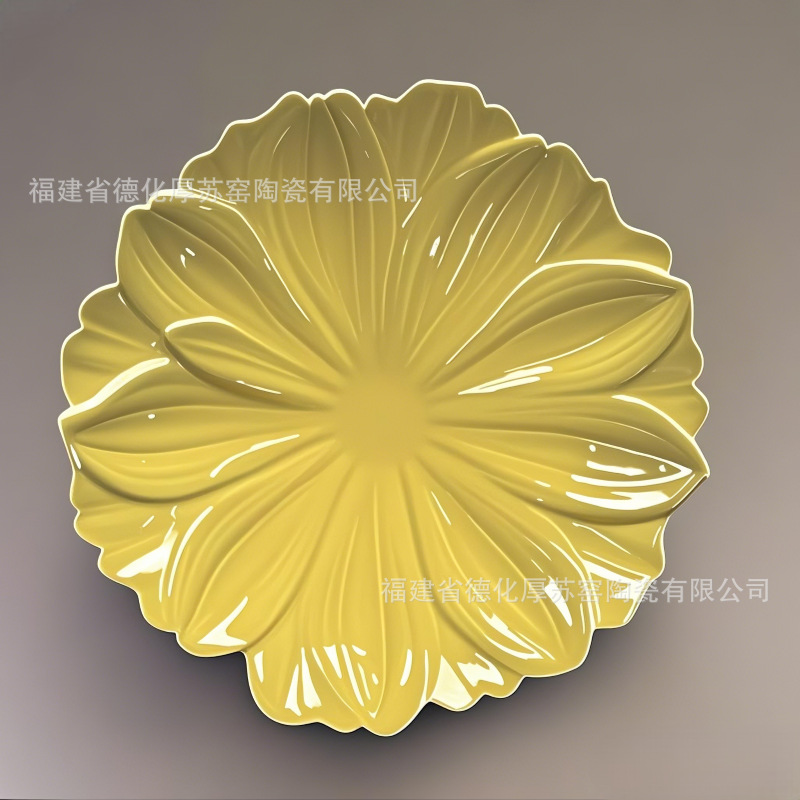 クリームイエローのエンボスフラワーセラミックプレートアマゾンクロスボーダーカスタマイズされた北欧スタイルのフルーツサラダプレートセラミック花びらプレート