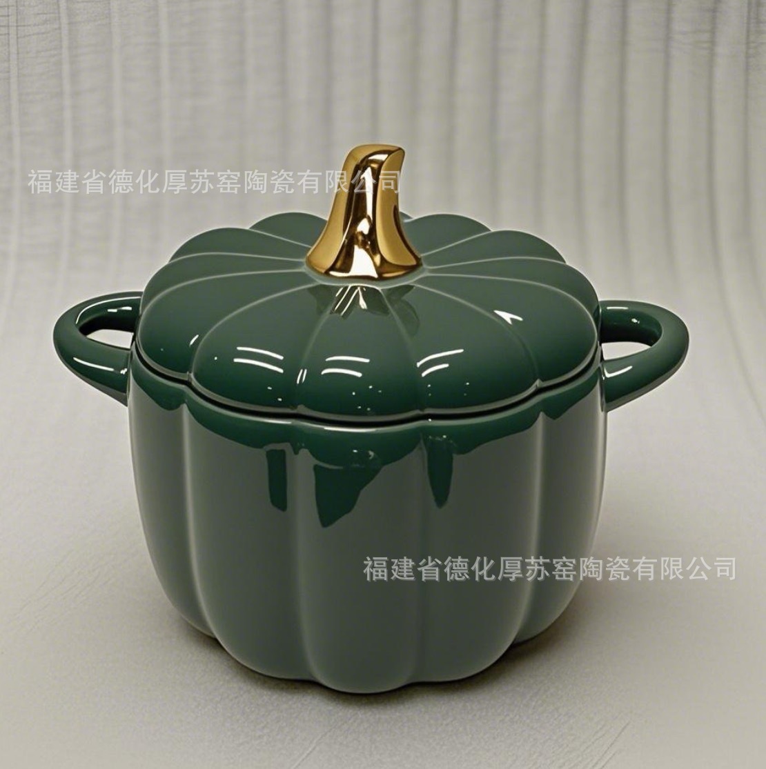 ヨーロッパとアメリカのクロスボーダーカスタマイズされた緑のエンボスセラミックカボチャボウル耳付き収穫祭装飾電気メッキカボチャスープボウル蓋付き