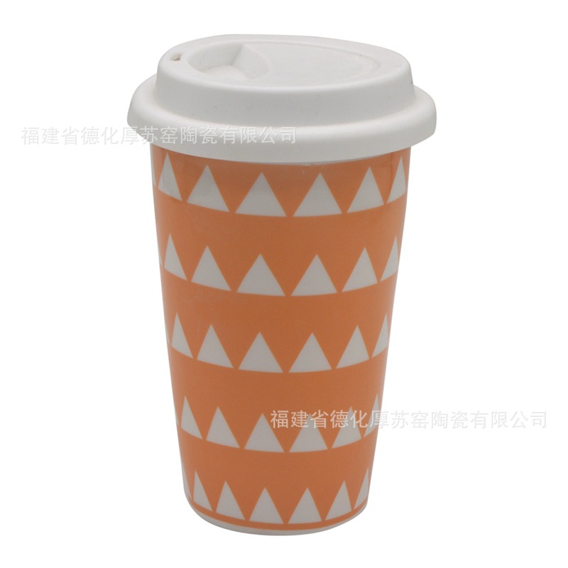 外贸出口定制橙色陶瓷随手杯三角形陶瓷杯咖啡杯带盖马克杯奶茶杯