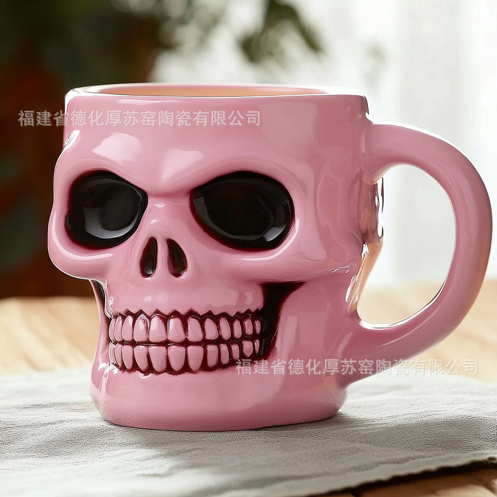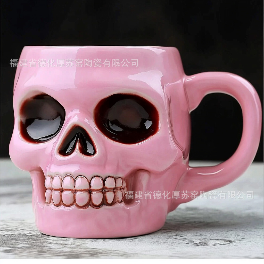 外贸定制粉色骷髅陶瓷马克杯ceramic mug立体彩绘头骨造型咖啡杯