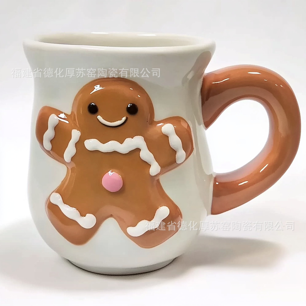 外贸出口定制圣诞节装饰浮雕美式杯子立体姜饼人陶瓷杯手工咖啡杯