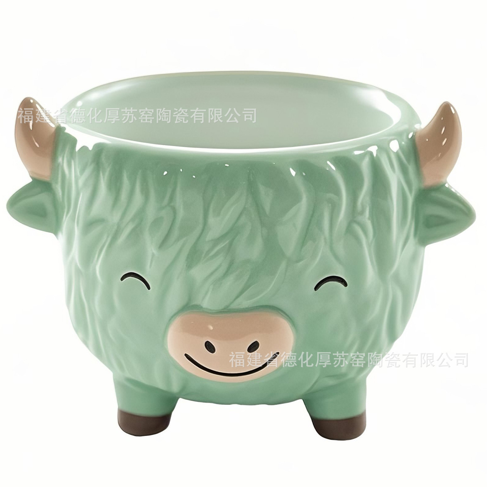 カスタマイズされたグリーンハイランド牛セラミックボウル外国貿易輸出漫画動物レリーフセラミックボウルヨーロッパとアメリカの装飾ボウルスープボウル
