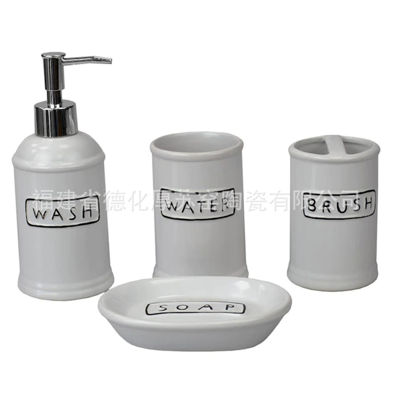 陶磁器のレリーフのロゴの浴室の4つのセットの輸出の白色は古いレリーフのロゴの乳液の瓶の石鹸の皿の口のコップを作ります。