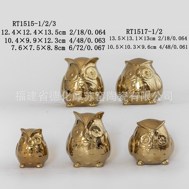 工場カスタムメッキ表面セラミックフクロウ貯金箱磁器質金色フクロウ貯金箱輸出