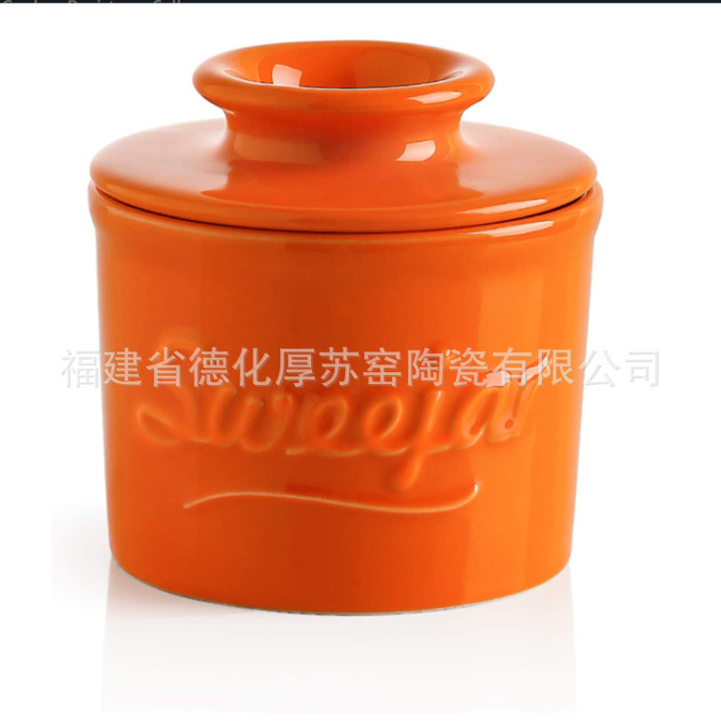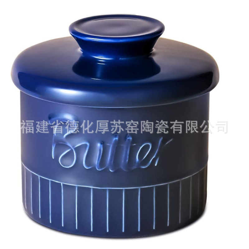 浮き彫りロゴ陶磁器黄盤缶国境を越えた輸出輸出3dロゴ陶磁器バター貯蔵缶対外貿易青
