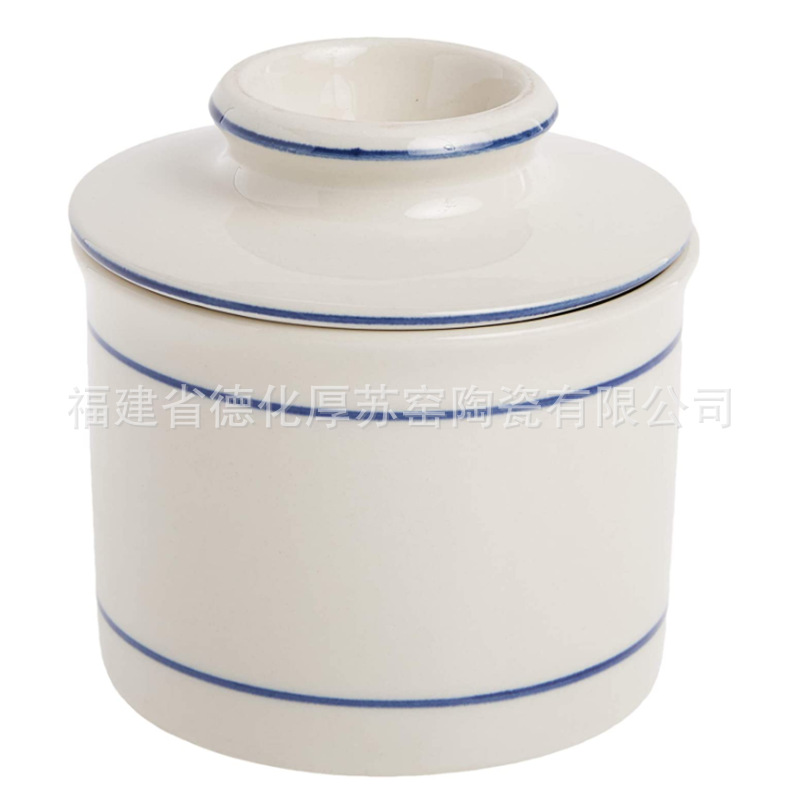 客注文ロゴ陶磁器黄盤缶輸出外ピン円形縞陶磁器バター貯蔵タンク対外貿易