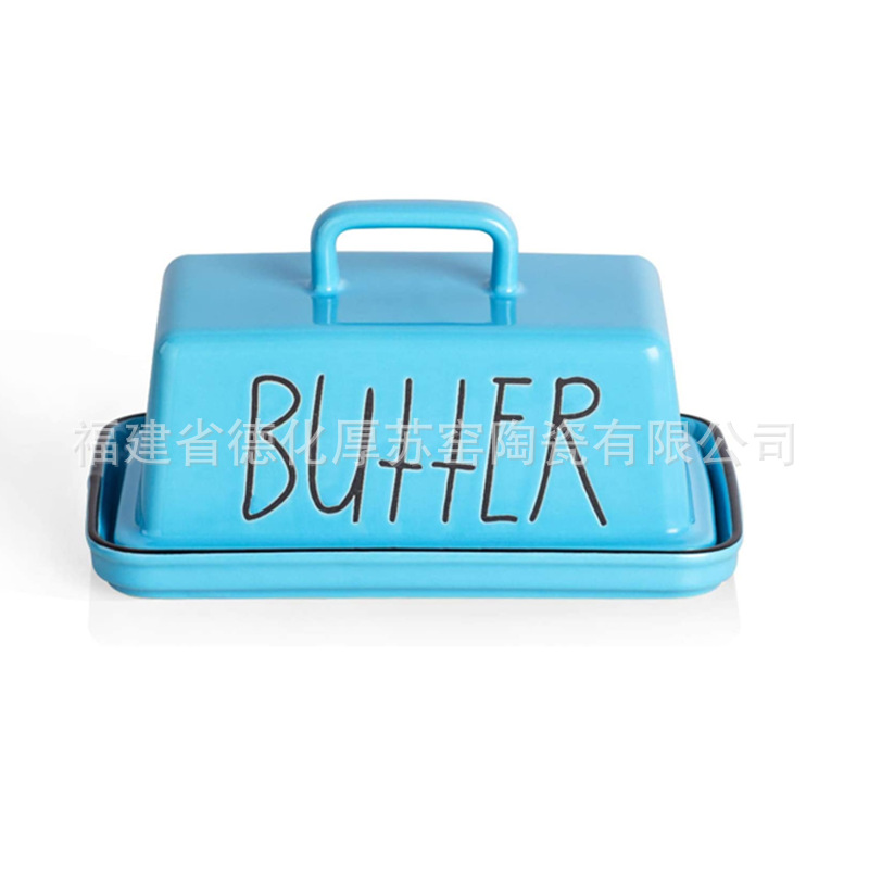 国境を越えたファッションの青いセラミックバター皿輸出シルクスクリーン印刷ロゴ角型セラミックバター皿外ピン