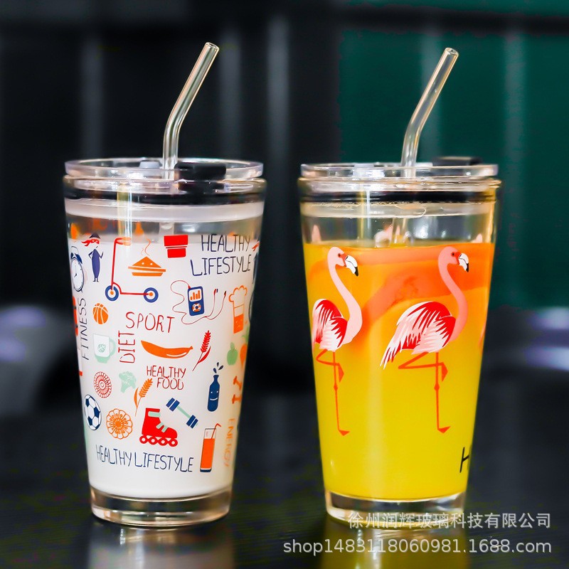 卸売りネット赤ストローカップ創意ガラスジュースカップ目盛りコーヒーカップミルクカップ学生水カップ印刷ロゴ