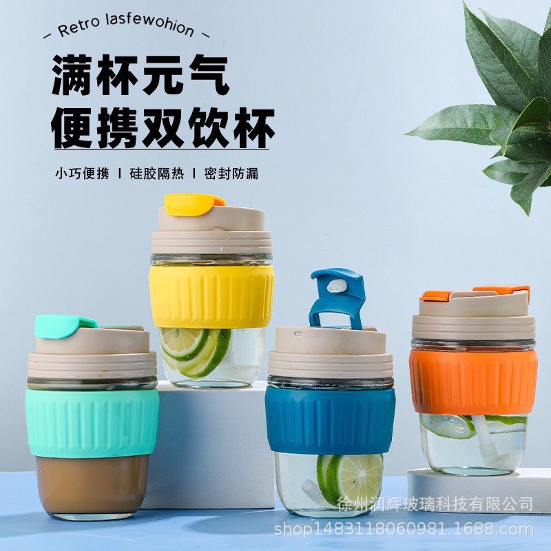 高颜値コーヒーカップガラスストローカップ女ins風水カップ蓋付きクリエイティブダブルカップネット赤同品プレゼント