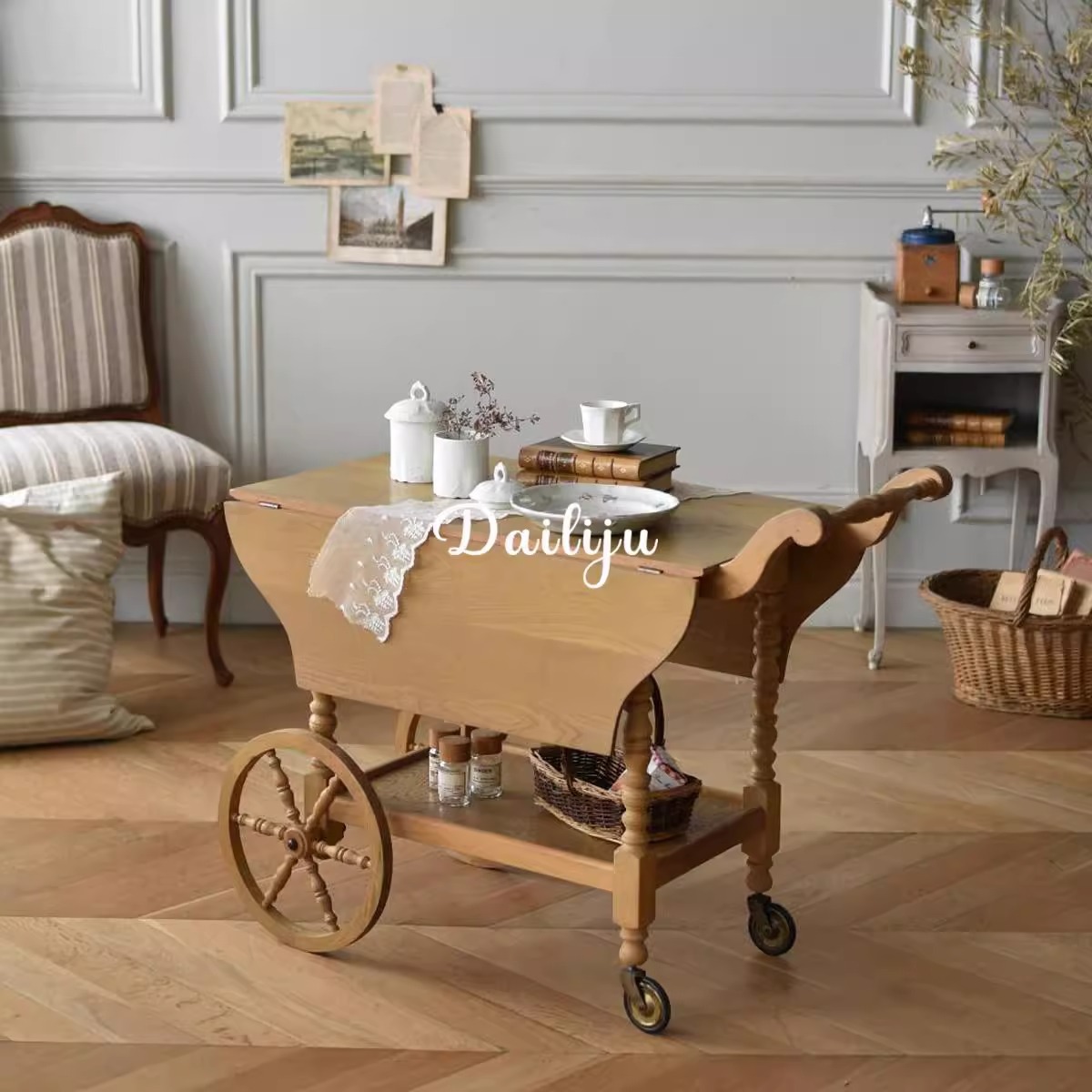 アンティークモバイルダイニングカート無垢材レトロサイドテーブルコーナーテーブルフレンチスタイル可動コーヒーテーブルバルコニー小さなテーブル