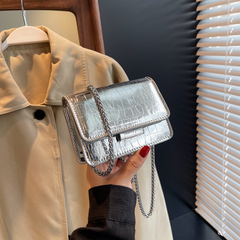 2024夏の新しいバッグの女性の明るい面の銀色のミニの小さい方はファッションのワニの紋様のエンボスのチェーンの斜めのショルダーバッグを包みます。