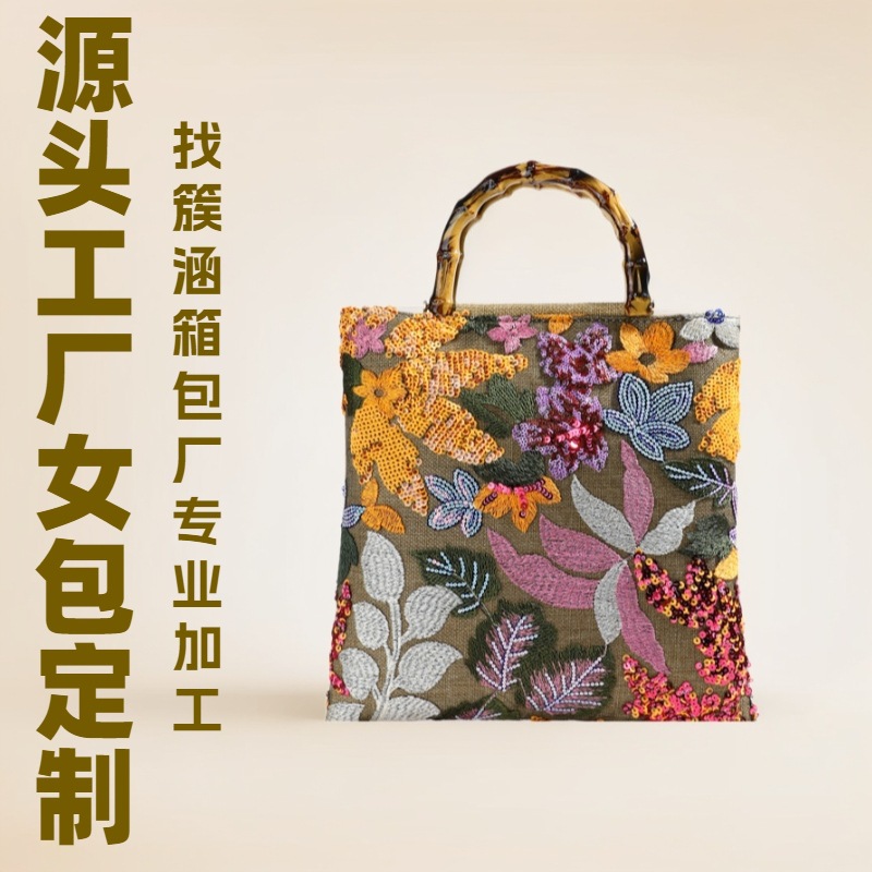ソース工場加工カスタマイズされたクロスボーダーレディースバッグ竹スパンコールバッグヘビーデューティフラワー刺繍アンティークスタイルレディースハンドバッグ