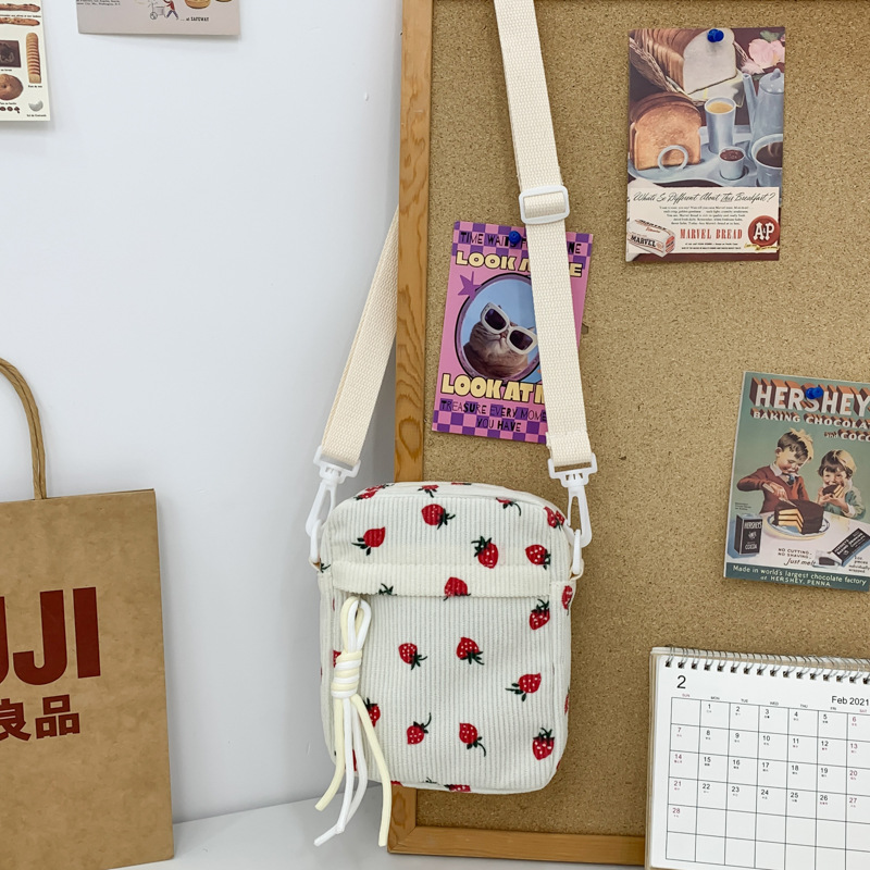 2025春の新型コーデュロイ超火小カバンファッションストライプかわいいイチゴプリントカジュアル携帯電話斜め掛けバッグ