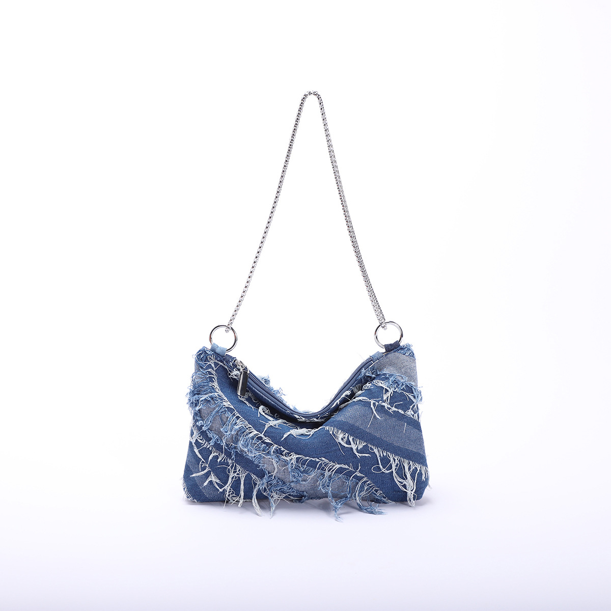 グラデーション水洗いブルーデニムバッグ越境欧米潮乞食風破洞流蘇包チェーンシングルショルダーバッグ