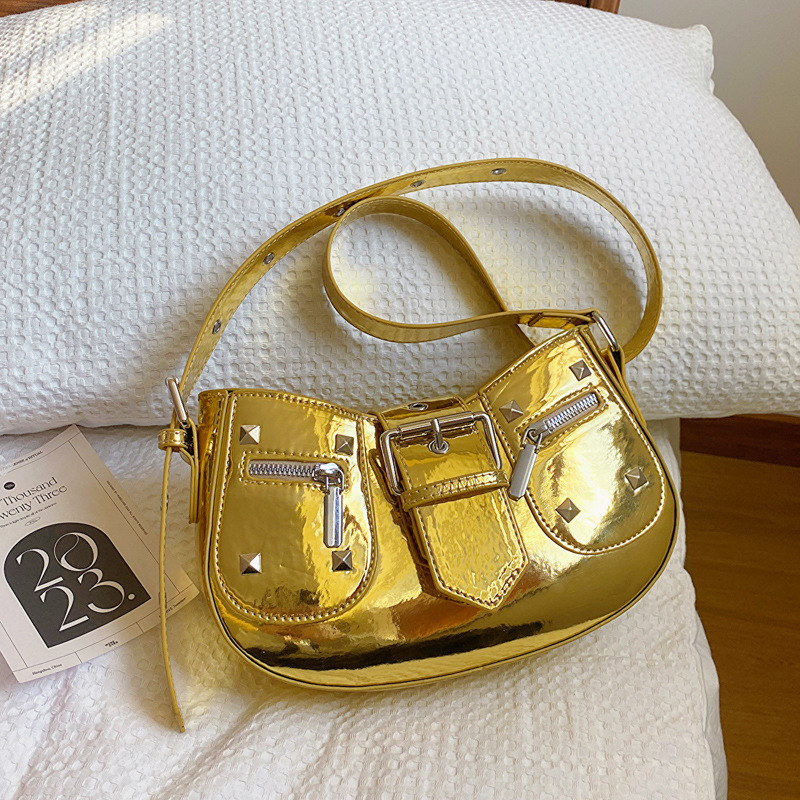 バッグの女性の新しいファッションのクールな柳の釘の車の風の漆の皮のPUはボタンを掛けて高級感のショルダーバッグの洋風の女性の斜めのショルダーバッグを包みます。