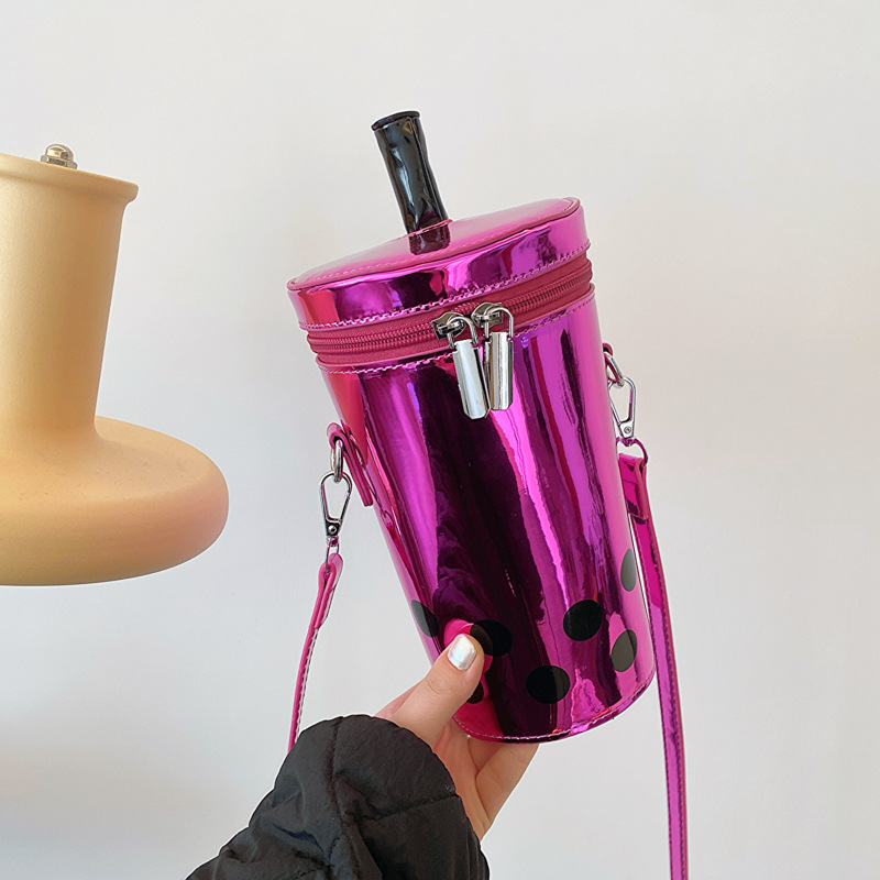 高颜値ミルクティーカップバッグ女性の新しい明るい面にペンキを塗った波点女性バッグ円筒バッグ金属感洋気斜めショルダーバッグ