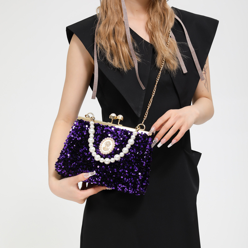 女性カバン新作スパンコールドレスイブニングバッグ紫のスパンコールクリスタル名媛風高級感クリップパールハンドバッグ