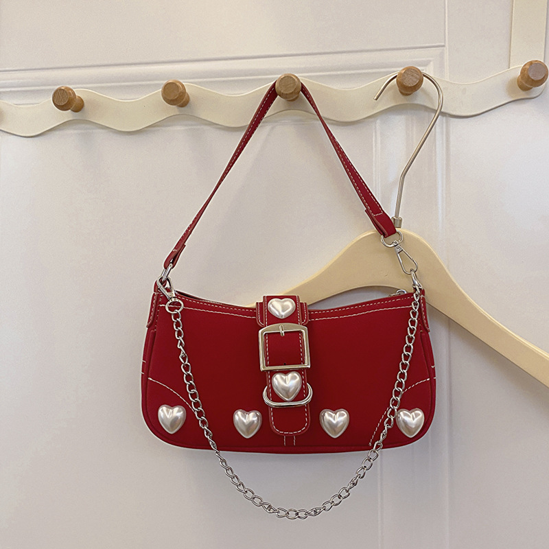 バッグ女性の新しい甘いスタイルパール愛の装飾トレンディなバゲットバッグ通勤トップショルダーショルダーバッグチェーンクロスボディバッグ