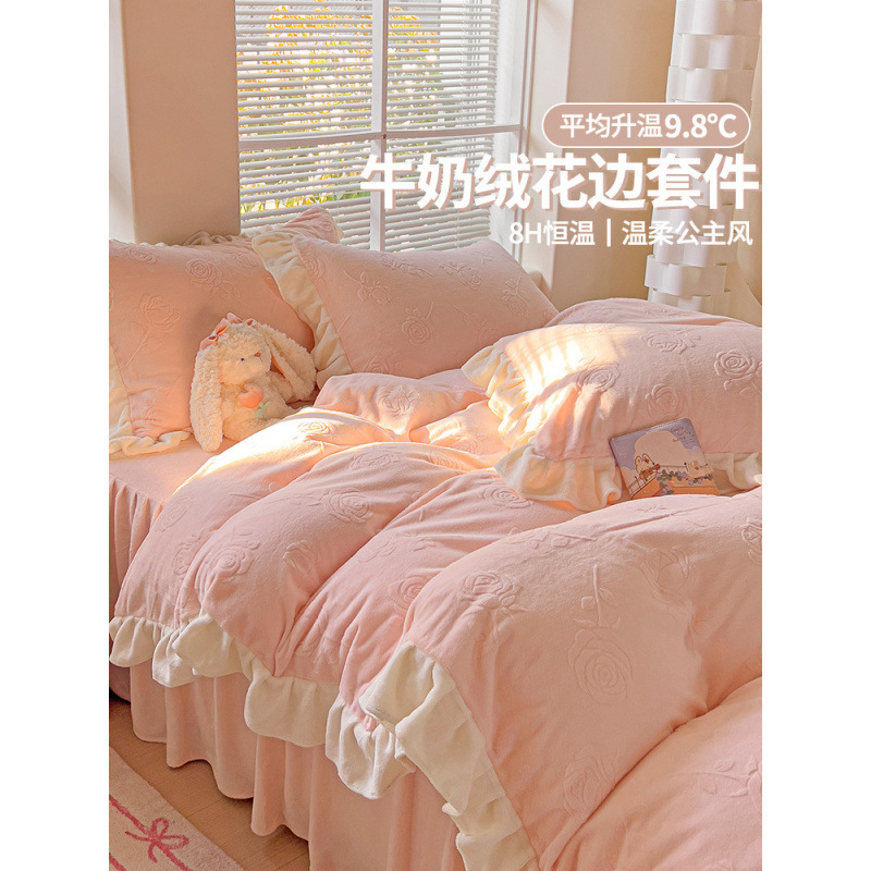 お姫様風彫刻ミルクベルベットベッド4点セット冬の厚いサンゴベルベットピンクの布団カバーとベルベットシーツのベッドスカート