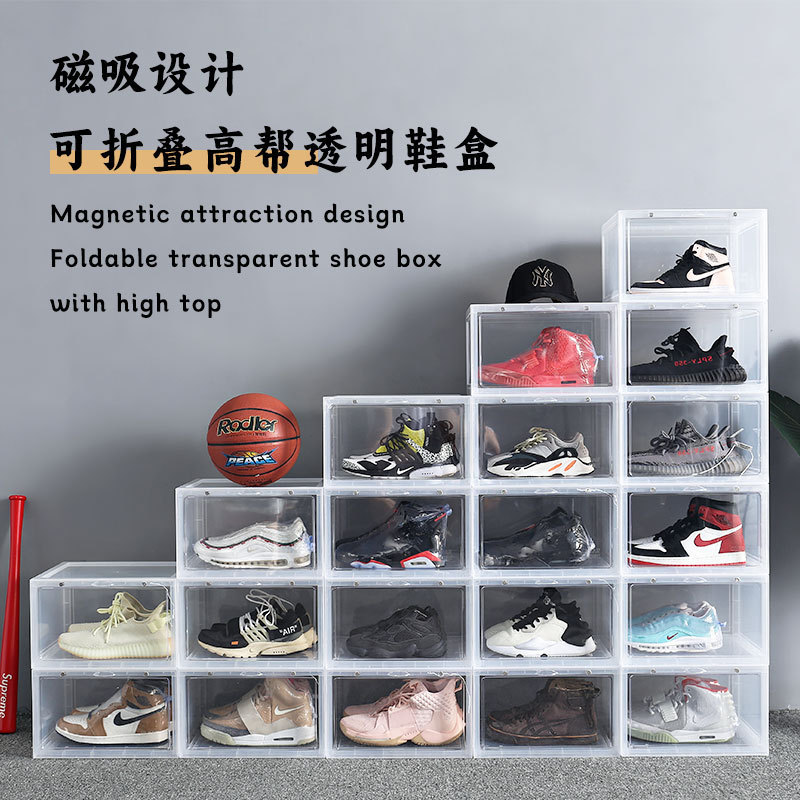 特大の厚く硬く高透明な収納サイドオープンプラスチック折りたたみ式防塵磁気透明収納ボックス靴箱