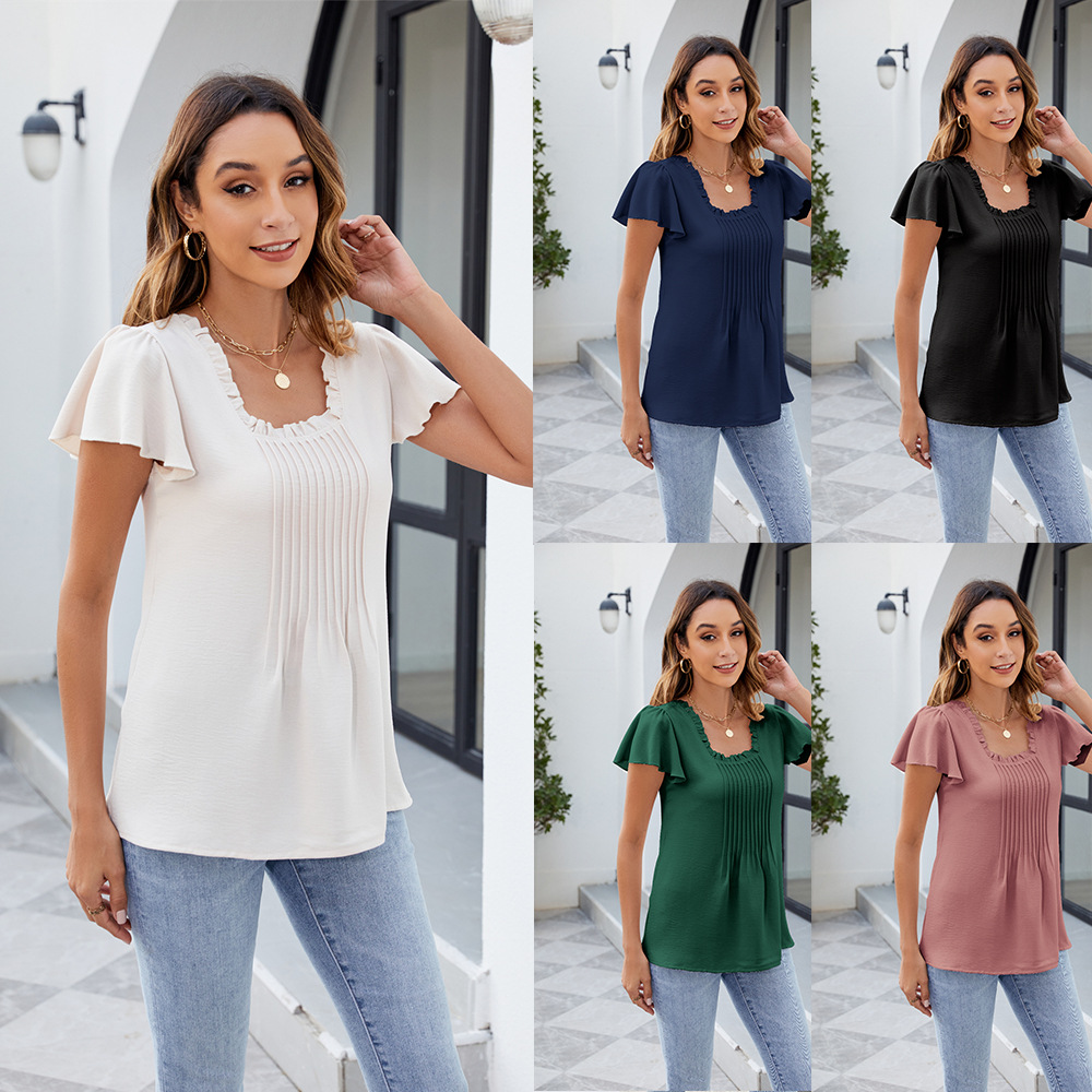 アマゾンクロスボーダー欧米対外貿易2025春夏新作ファッションvネックスリム半袖カジュアルフリルtシャツ女性