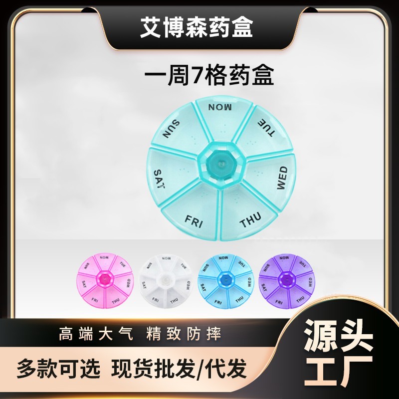 メーカー直販のプラスチック薬箱の丸い形は一週間七格の薬箱7格の回転できる錠剤箱です。