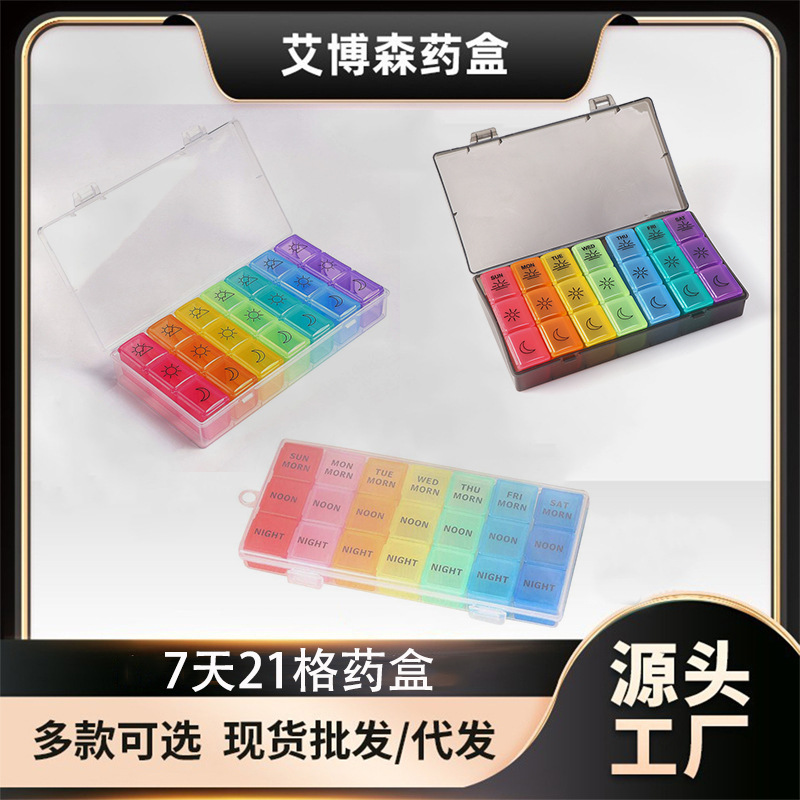 外国貿易新型薬箱便利式旅行携帯収納箱虹色7彩21格PP材質プラスチック薬箱