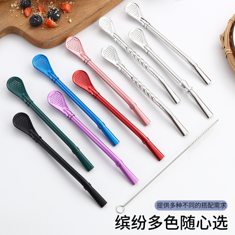 304ステンレスネット赤マテ茶ストロースプーン一体創意攪拌両用残渣ジュース花茶フィルター