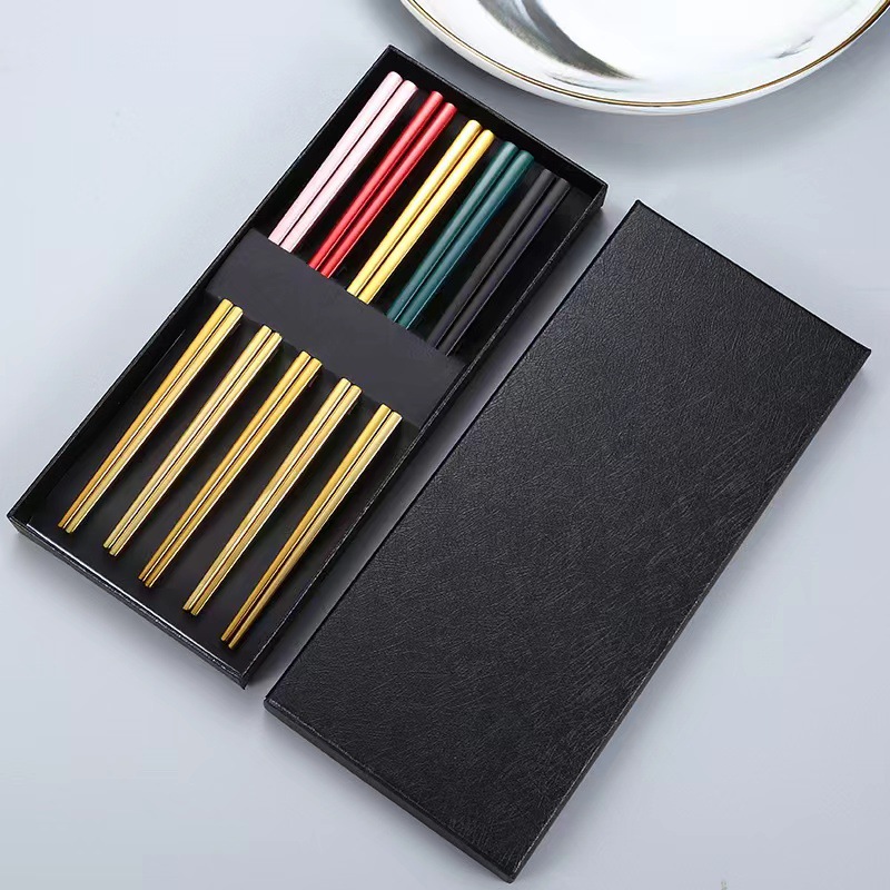 304ステンレス鋼チタンメッキ箸家庭用23cm全角箸中国式ホテル滑り止め8センチ箸五足礼箱セット