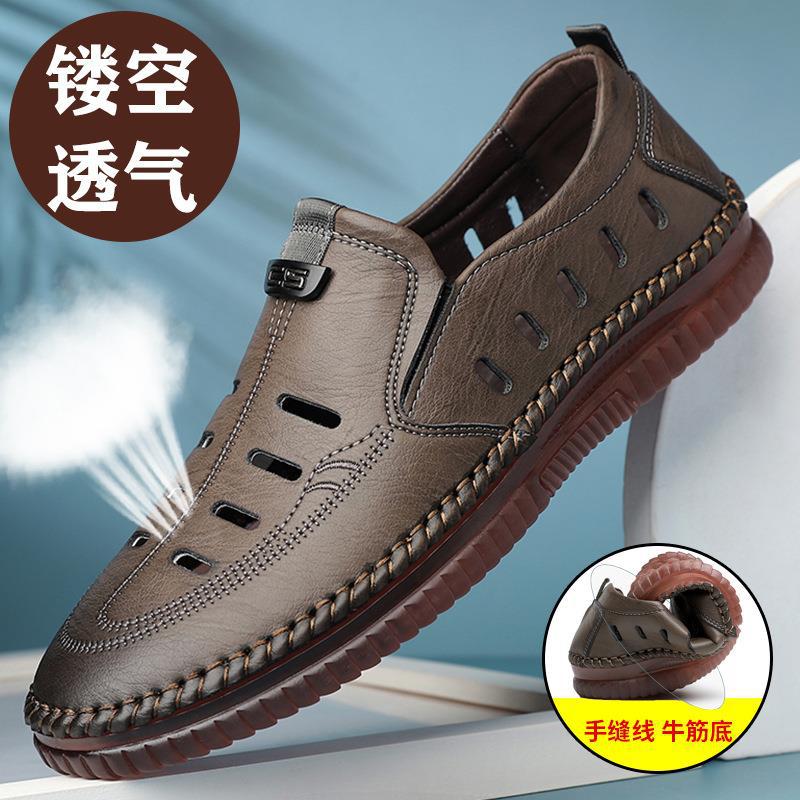 皮のサンダルの夏の男性のカジュアルな透かし彫りの柔らかい底の中年のお父さんの靴の牛の筋肉の底の滑り止めの車の穴の靴