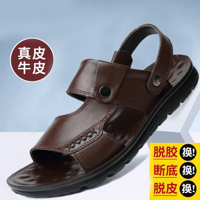 男性本革サンダル夏の新型滑り止めビーチ靴牛革サンダル通気性カジュアルソフト底皮サンダル
