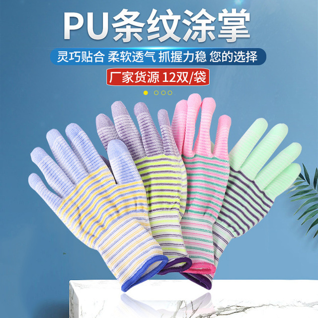 13針ナイロンストライプpuは、クリーン手袋の通気性の薄いタイプの接着剤を塗って、労働保護手袋工場を摘採します。
