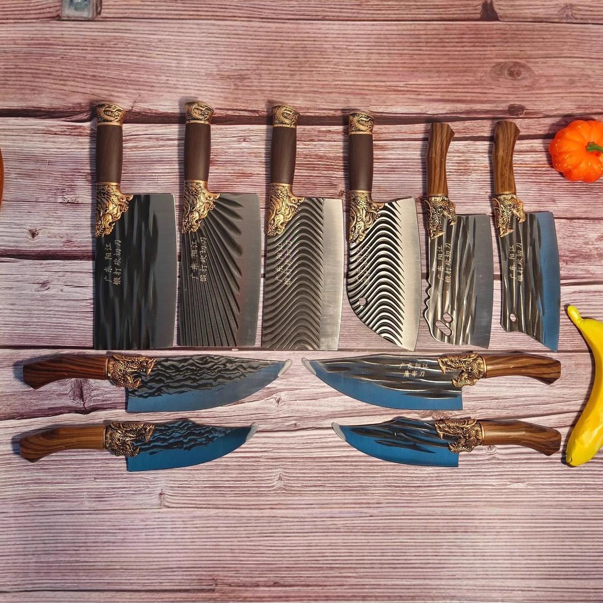 国境を越えた卸売りハンマーの紋様の鍛錬は鋭くて骨の刀の屋外のブタの牛の羊の屠殺の専用の曲がった刀の台所の家庭用の包丁を切ります。