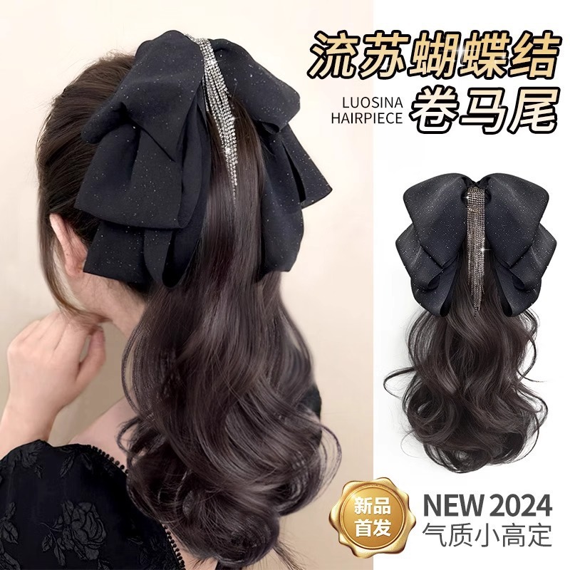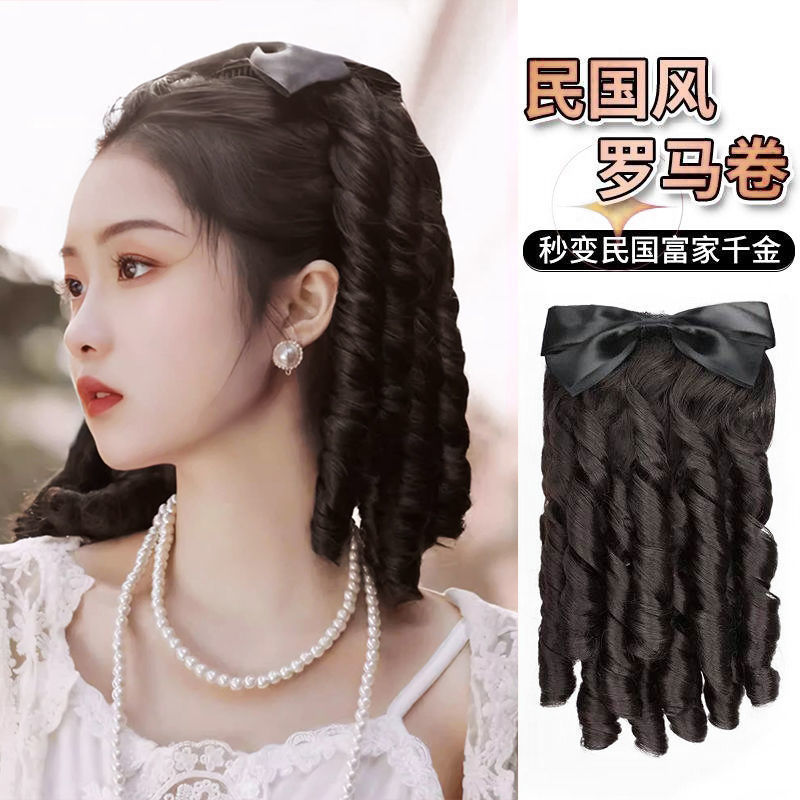レトロローマンカーリーポニーテール、中華民国風チャイナドレスヘアスタイル、プリンセスカーリーコーム式リボンウィッグポニーテール
