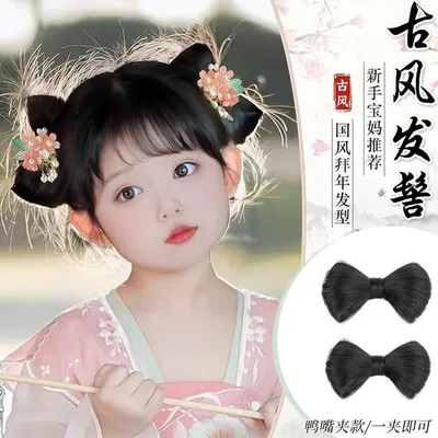 子供の漢服の時代の服の一体式のヘアバッグの蝶結びの形のかつらの髪飾りの女の子の古風な髪飾り